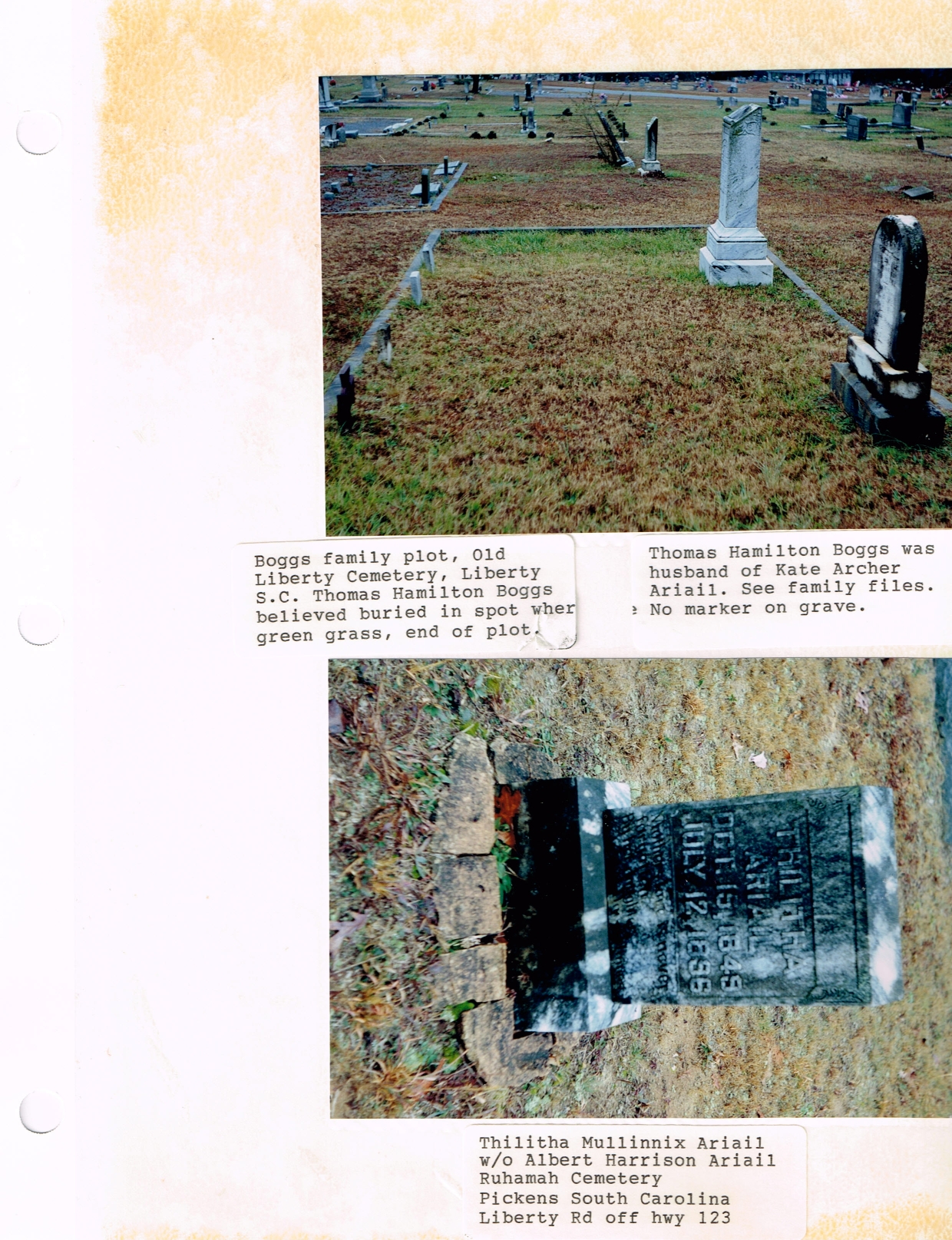 Top picture is the Boggs family grave plot. The green plot at the far end of the family lot is the place where the Ariail Cemetery Committee placed a new marker on the unmarked grave of Thomas Hamilton Boggs, son of George W. Barzelai Boggs and husband of Kate Archer Ariail. Thomas was also the brother of Hon. Julius Elkanah Boggs of Greenville, South Carolina. Bottom picture is marker for Thilitha A. Mullinnix, 1 st wife of Albert Harrison Ariail. The Ariail Cemetery Committee restored this stone by cleaning and shoring up the base of the stone so it’s integrity would be maintained.