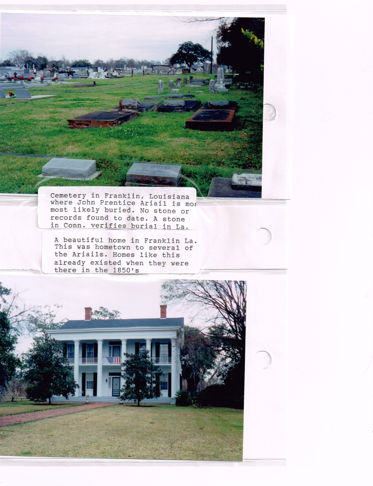 Top picture is cemetery where John Prentice Ariail is most likely buried in Franklin, Louisiana. His sister, Lucy Emeline Ariail may also be interred here. They were the son and daughter of Luke Ariail from Connecticut. In addition to these two, Manna Rich Ariail (brother of Luke Ariail), Julius Deming Ariail and Judge Manna Rich Ariail, children of Luke Ariail were also in Louisiana. One of the other Ariail girls, Sabra Maty Ariail also lived there for a while. Bottom picture is one of the many beautiful homes that existed during the time they were living there and are still in mint condition today.