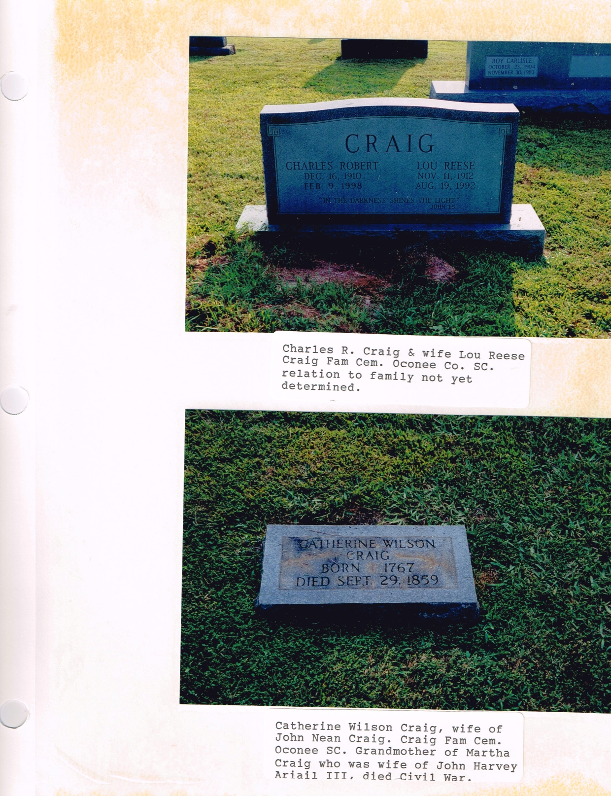 Top picture is grave stone for Charles Robert Craig and his wife Minnie Lou Reese. Charles is a descendant of Sarah Jane Ariail. Bottom picture is marker for Catherine Wilson, wife of John Nean Craig. She was the grandmother of Martha Craig, wife of John Harvey Ariail, III, who died in the Civil War.