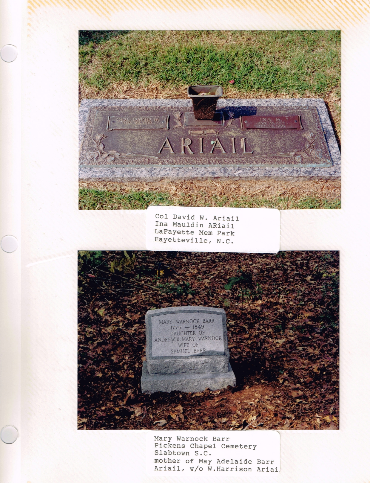 Top picture is of the grave stone for Col. David William Ariail and his wife Ina Estella Mauldin. Col. David William Ariail is the son of David Blassingham Ariail. Bottom picture is of the marker for Mary Harvick, wife of Andrew Warnock. She is the mother of Mary Adelaide Barr who became the wife of William Harrison Ariail. She is buried in the Pickens Chapel Cemetery near the place where John Harvey Ariail and Chloe Ives are interred. Her father was from Craig’s Head, Ireland; therefore, this is why the Ariail family in the Nails Creek Community always thought the Ariail’s came from Ireland.