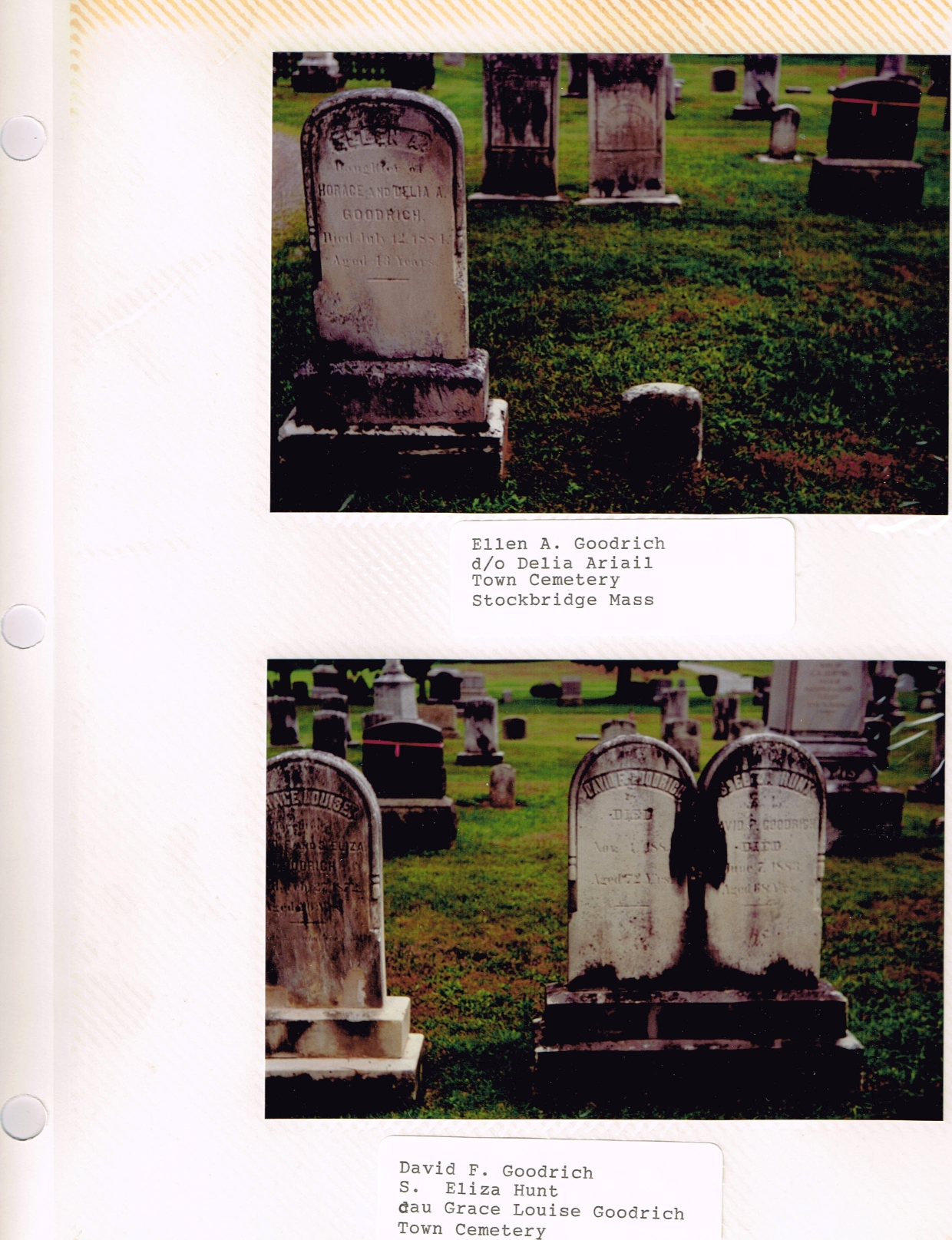 Top picture is the marker for Ellen A. Goodrich, daughter of Delia Ariail. Bottom picture is marker for relatives of Horace Goodrich, husband of Delia Ariail.