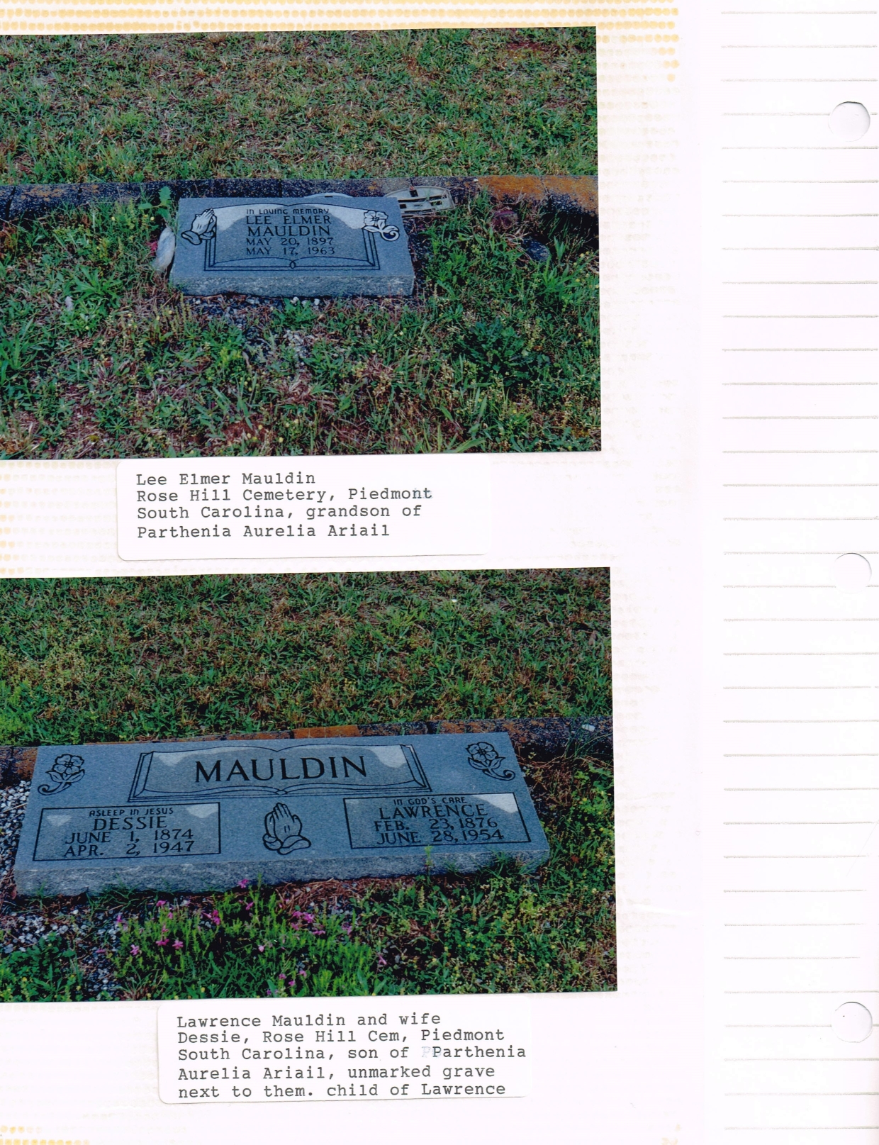 Top picture is marker for Elmer Lee Mauldin, a descendant of Parthenia Aurelia Ariail. Bottom Picture is marker for William Lawrence Mauldin and his wife Agnes Destamony “Dessie” Hayes. William is the son of Parthenia Aurelia Ariail.