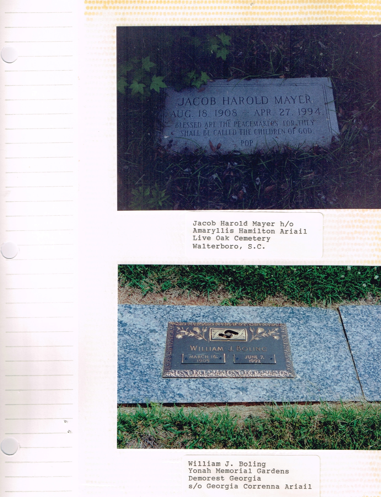 Top picture is grave marker for Jacob Harold Meyer, husband of Amaryllis Hamilton Ariail. Bottom picture is marker for William J. “Bill” Boling, husband of Estelle H. Wilmot. William is the son of Georgie Correnna Ariail.