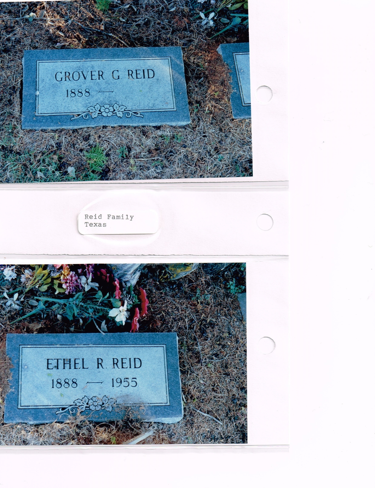 Top picture is marker for Grover Gay Reid, son of Stephen C. Reid and a descendant of Sarah Jane Ariail. Grover died in 1965 in De Leon, Texas. Bottom picture is marker for Ethel R. Robertson, 2nd wife of Grover Gay Reid.