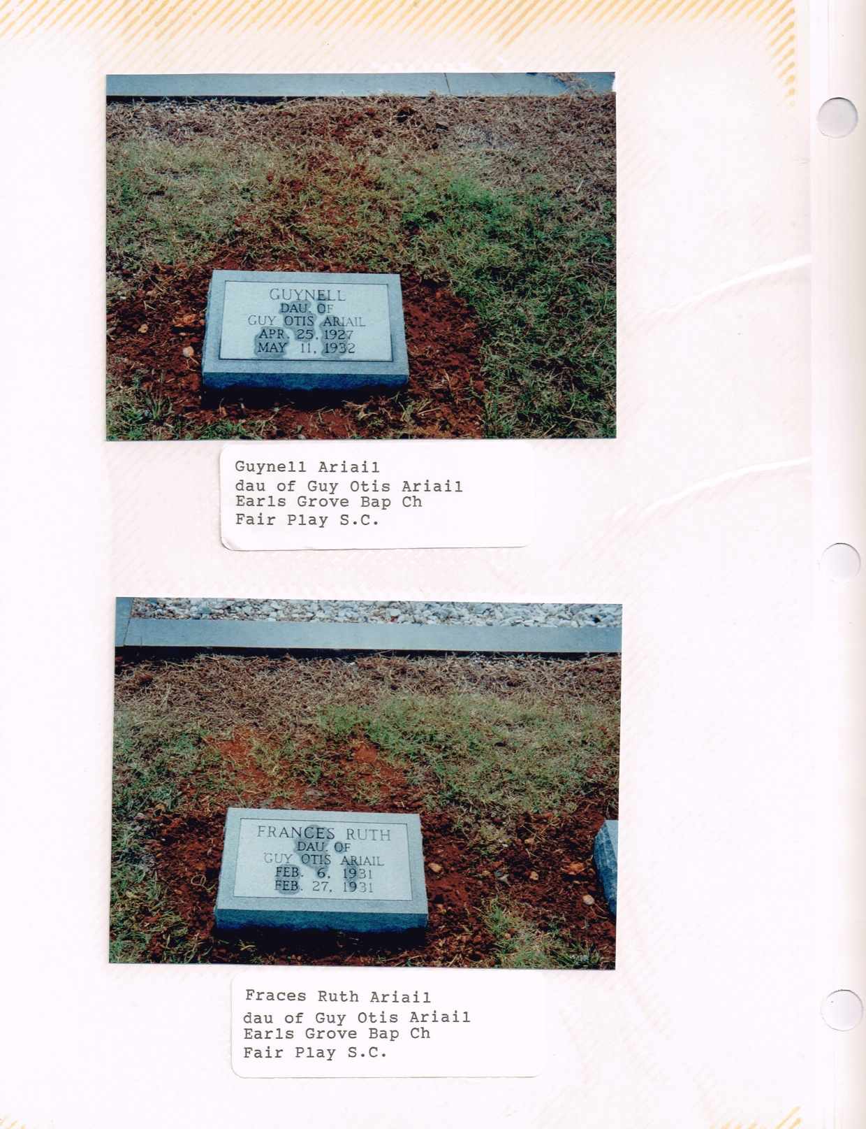 The two stones were placed by the Ariail Family Cemetery Committee. Top picture is marker for Guynell Ariail, daughter of Guy Otis Ariail. Bottom picture is marker for Frances Ruth Ariail, daughter of Guy Otis Ariail.