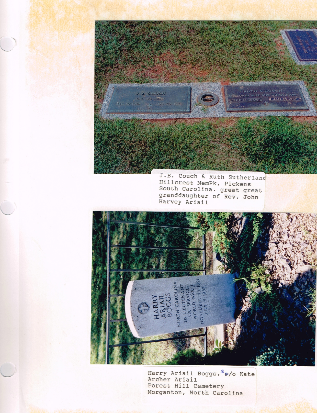 Top picture is marker for J. B. Couch and his wife Nancy Ruth Sutherland. Nancy is a descendant of Sarah Jane Ariail. Bottom picture is marker for Harry Ariail Boggs, son of Kate Archer Ariail.