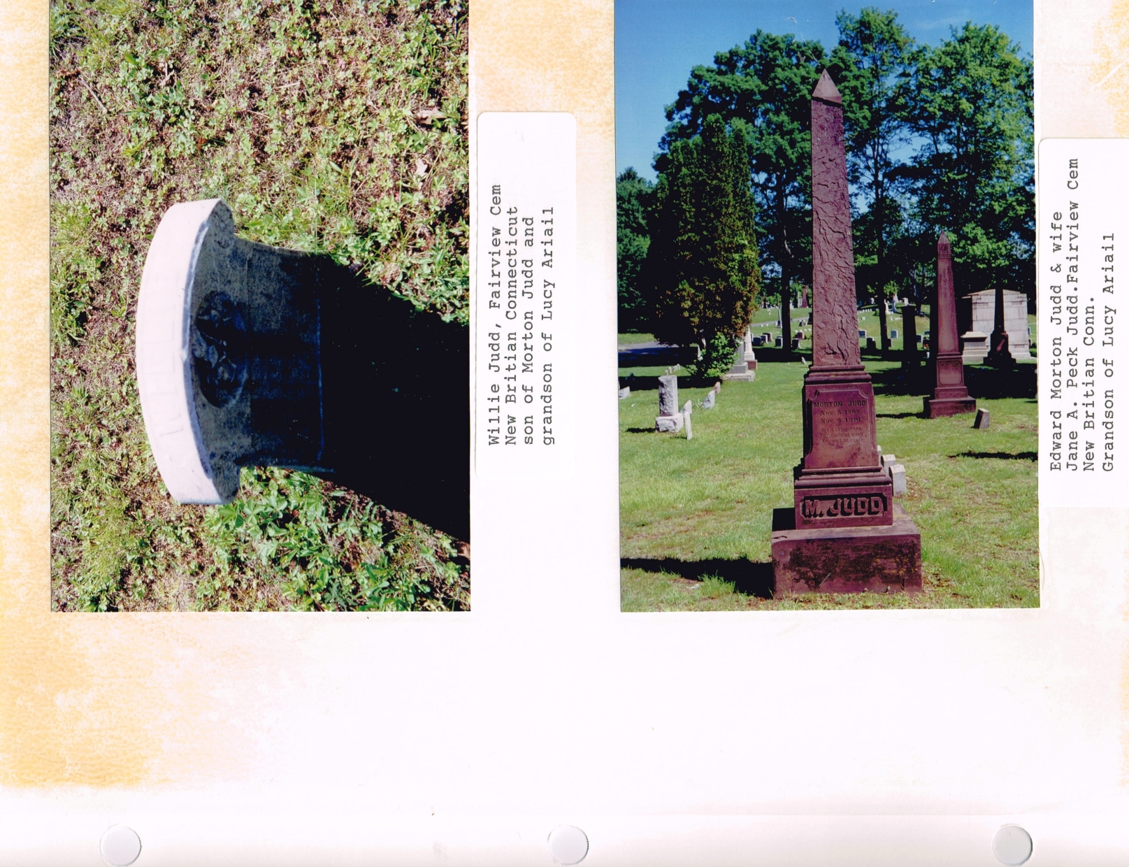 Left picture is grave marker for William Theodore “Willie” Judd, son of Judge Edward Morton Judd. Right picture is grave stone for Judge Edward Morton Judd and his wife Jane A. Peck. Judge Judd is the grandson of Lucy Ariail.