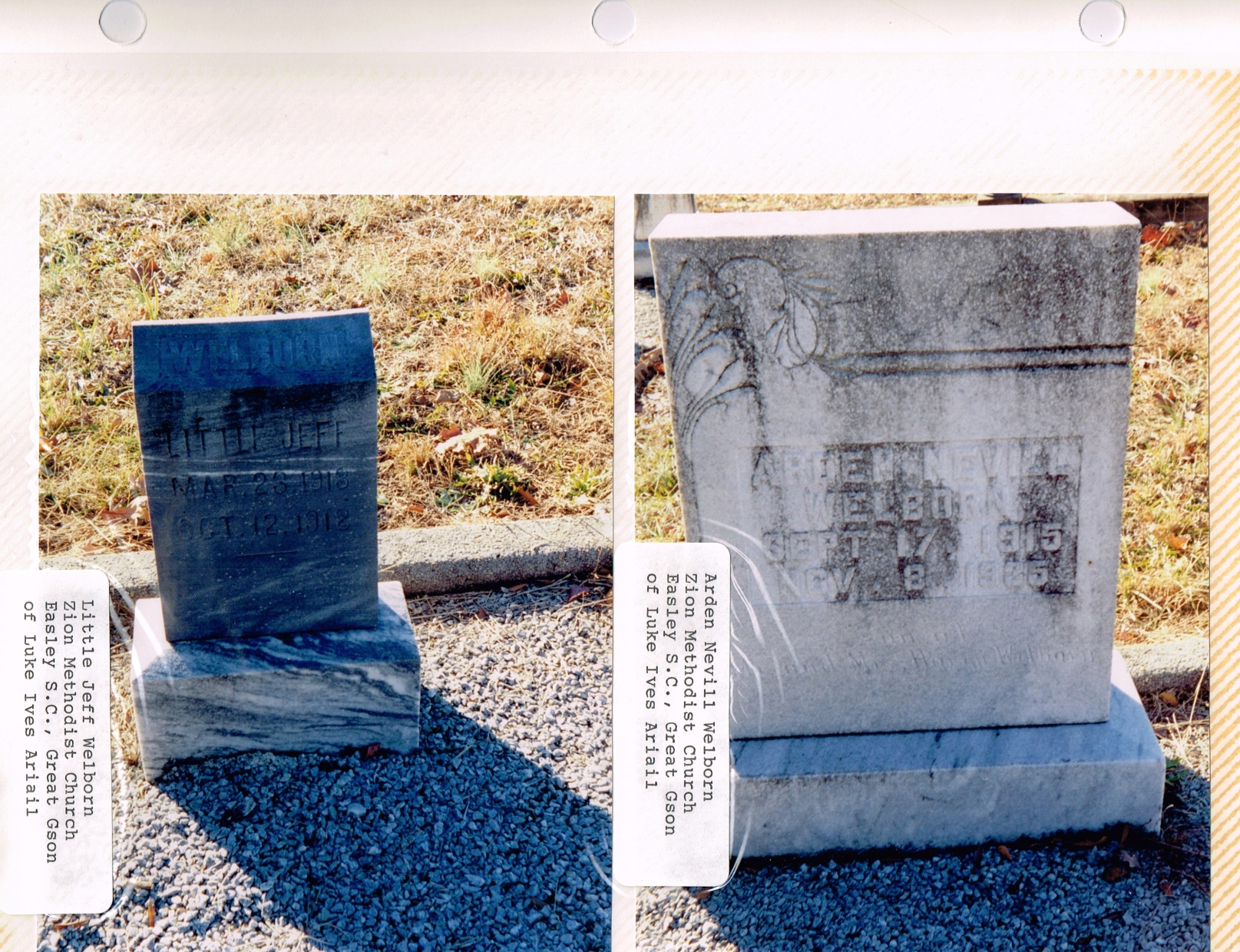 Left picture is marker for Little Jeff Welborn, son of Hovey Welborn and grandson of Elizabeth Climelia Ariail. Right picture is marker for Arden Nevill Welborn, son of Hovey Welborn.