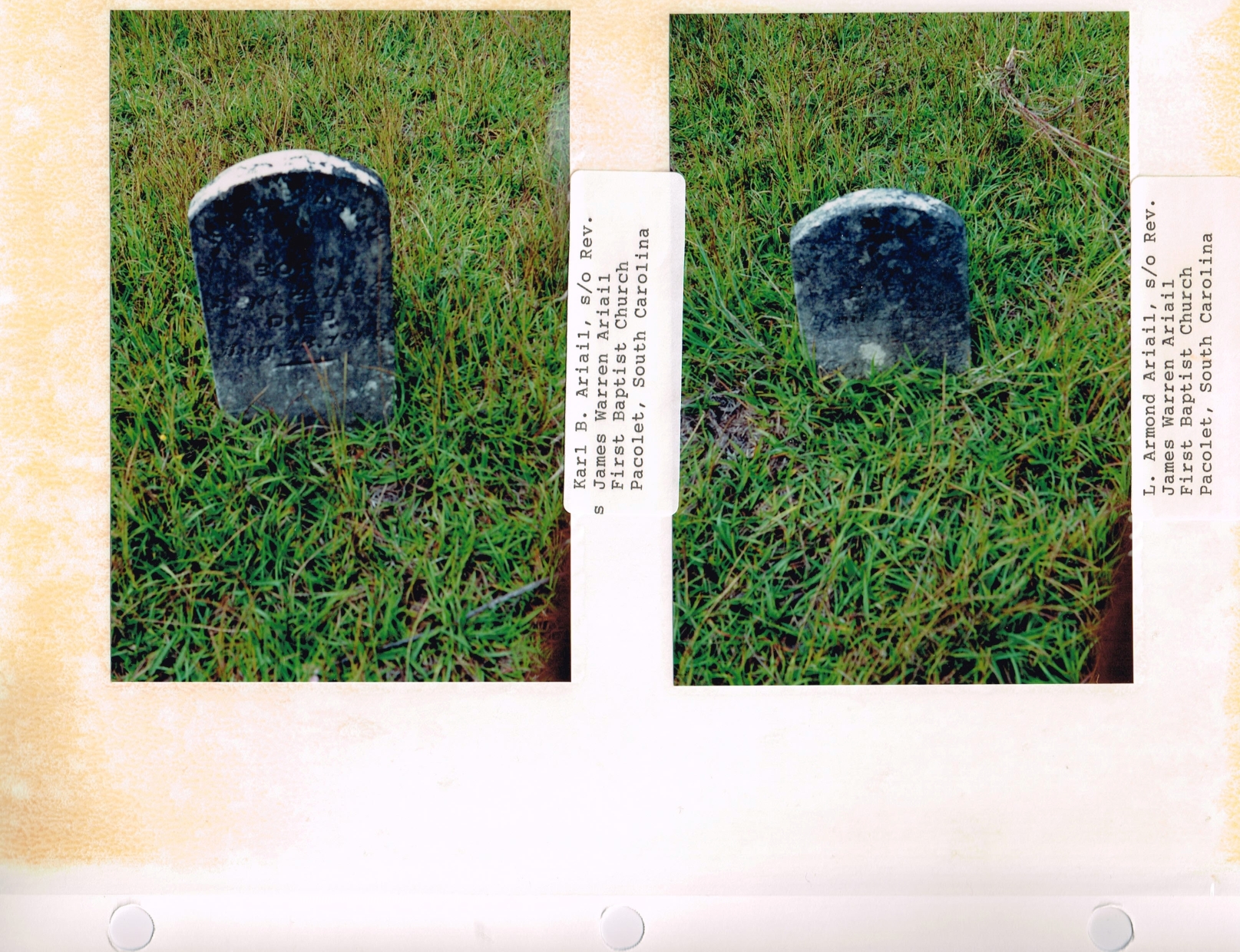 Left picture is marker for Karl B. Ariail, son of the Rev. James Warren Ariail. Right picture is marker for L. Armond Ariail, son of the Rev. James Warren Ariail who was the son of Luke Ives Ariail.