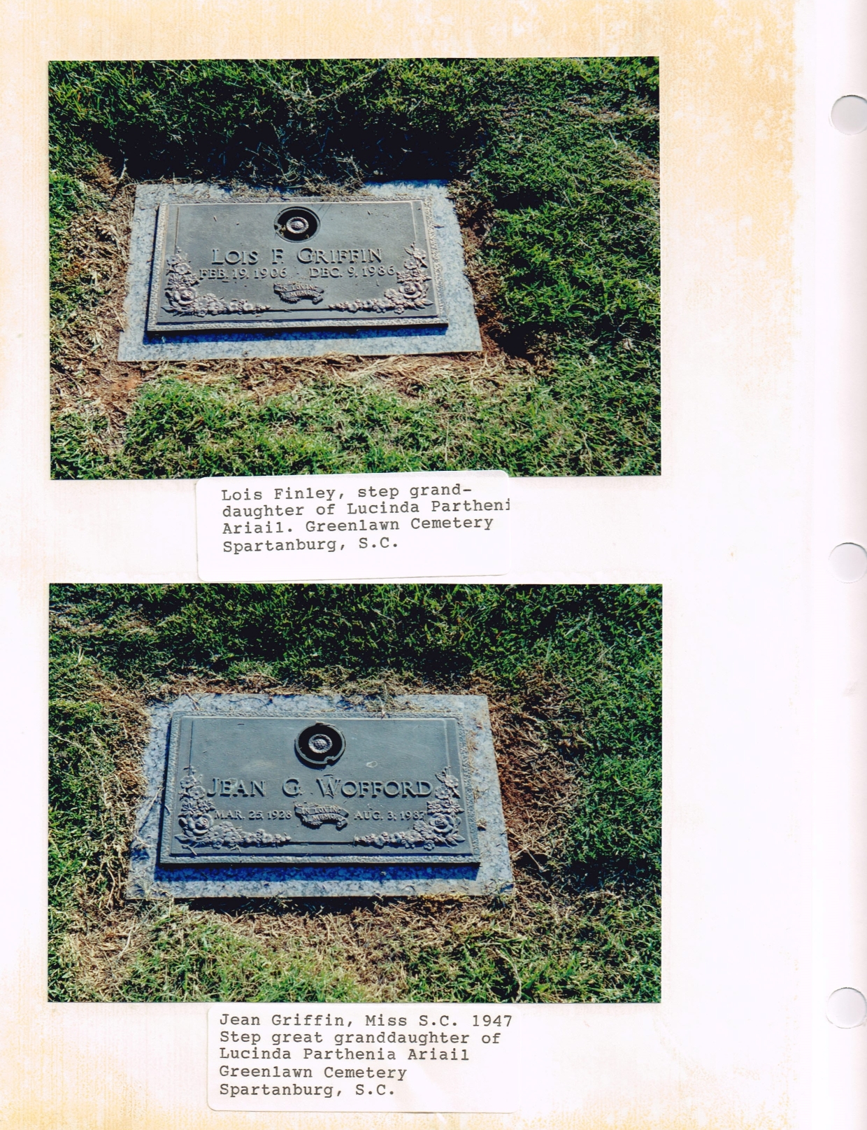 Top picture is marker for Lois Finley, wife of Joel R. Griffin. Lois is a step descendant of Lucinda Parthenia Ariail. Bottom picture is marker for Jean Griffin Wofford. Jean is a step descendant of Lucinda Parthenia Ariail.