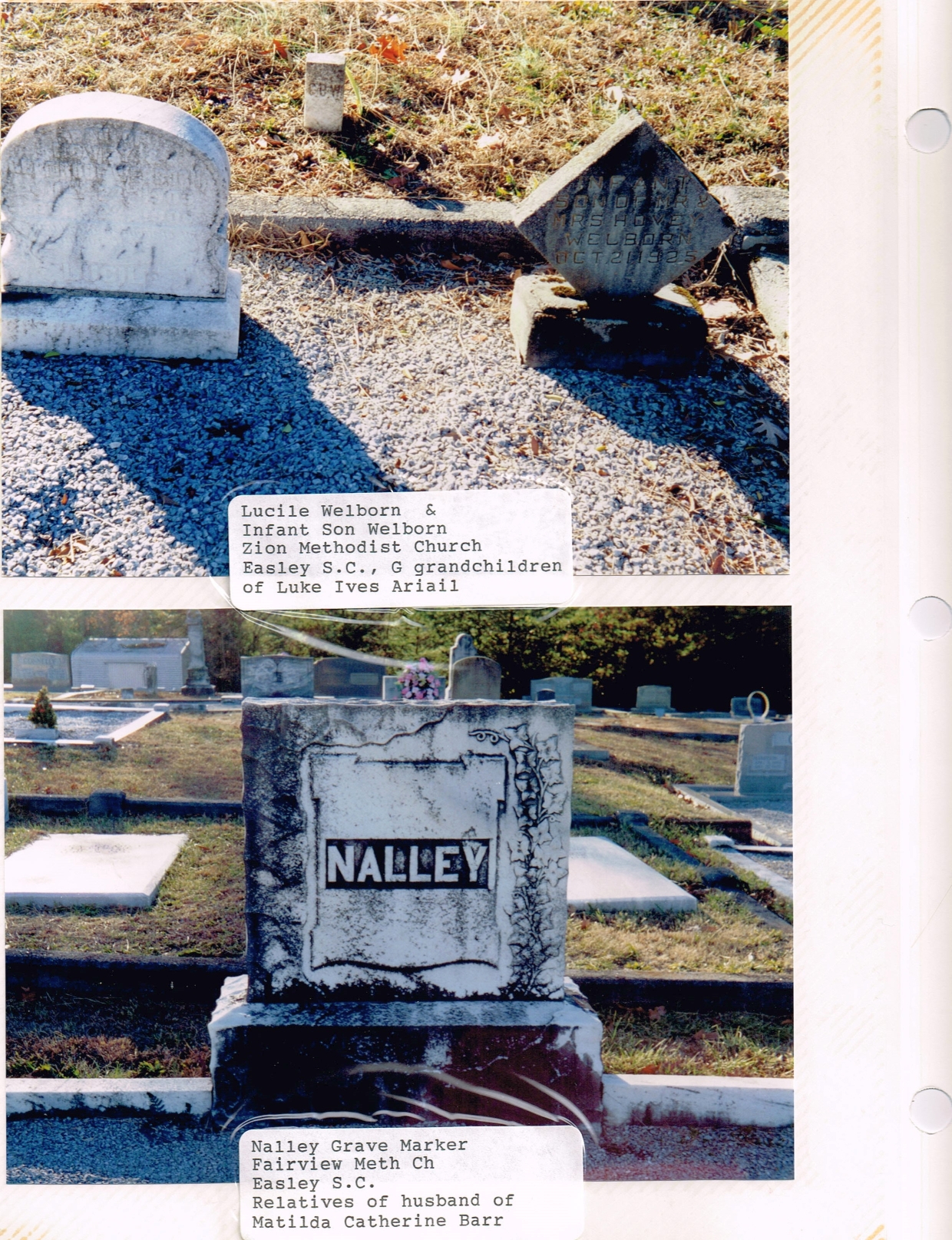 Top picture is marker for Lucile Welborn and Infant son Welborn, both children of Hovey Welborn. Bottom picture is marker for Nally family, relatives of Matilda Catherine Barr who is related to Mary Adelaide Barr, wife of William Harrison Ariail.