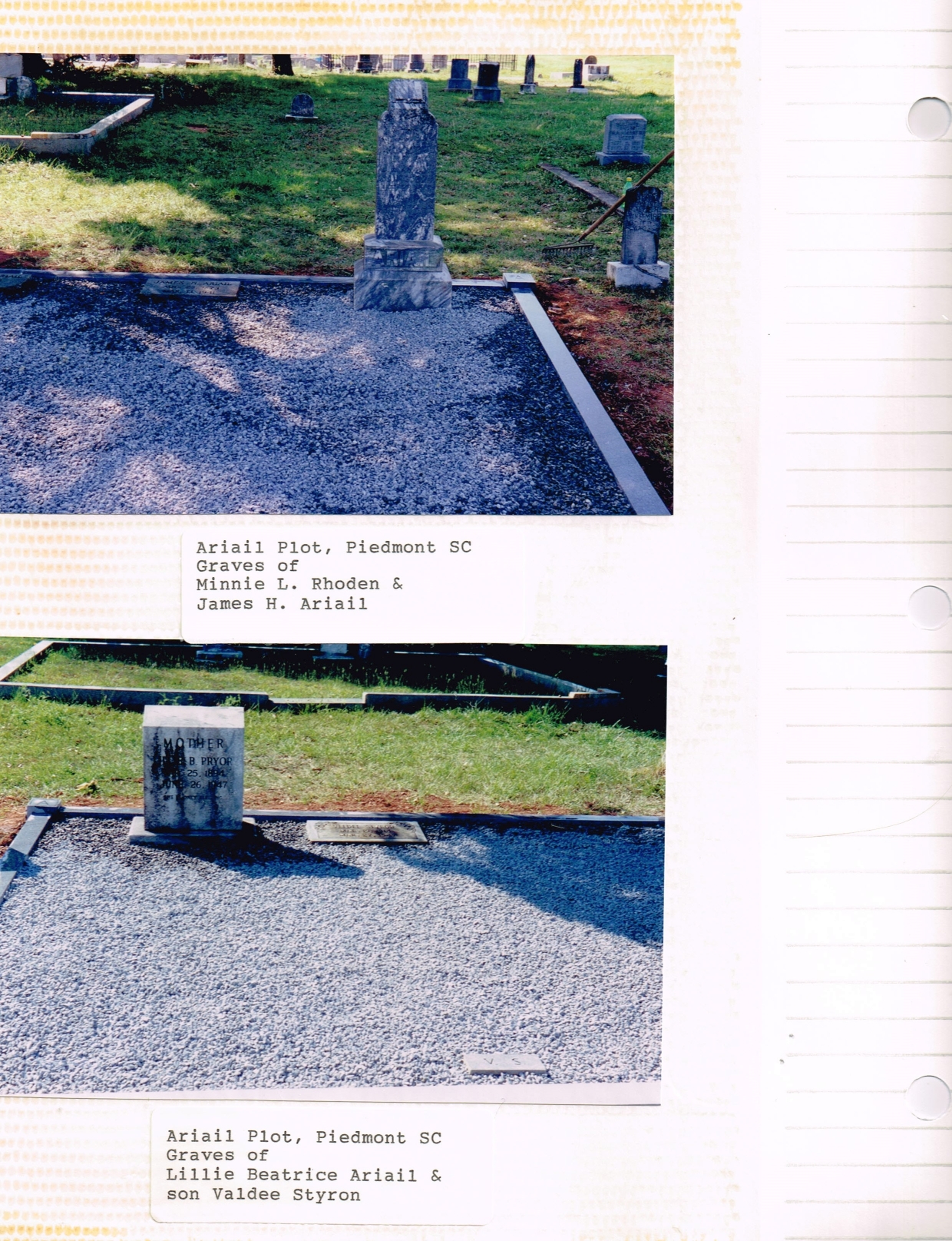 Top picture is markers for the graves of James Hamilton Ariail and his wife Mary L. “Minnie” Rhoden in the newly restored family plot of John Alvin Ariail. The large marker on right is for “Minnie” and the ground level marker on left is that for James Hamilton Ariail. The work was done by the Ariail Cemetery Committee. The bottom picture is for the markers of Lillie Beatrice Ariail and her son Nolan Veldee Styron. Lillie is the daughter of Lillie Beatrice Ariail. The work on this plot was done by the Ariail Cemetery Committee.
