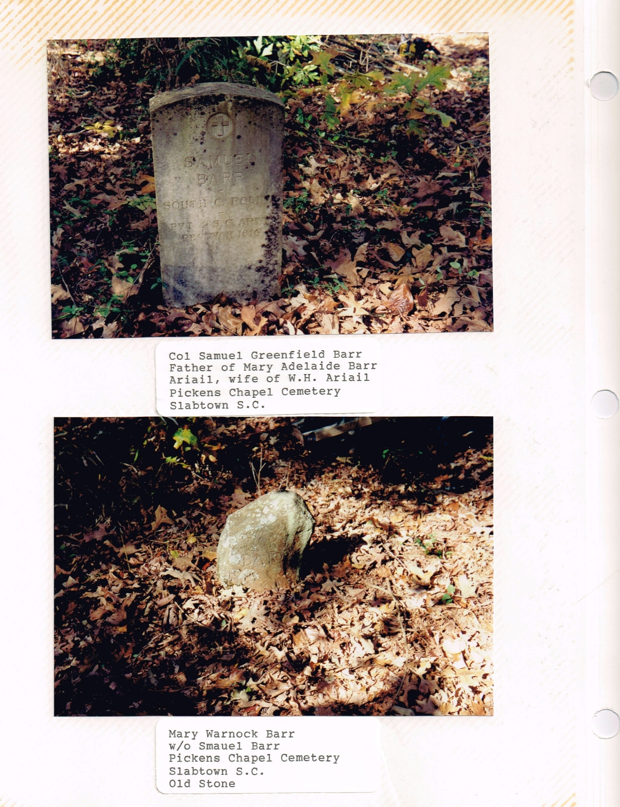 Top picture is of the marker for Col Samuel Greenfield Barr, father of Mary Adelaide Barr who is the wife of William Harrison Ariail. They are buried near the place where John Harvey Ariail, Sr., father of William Harrison Ariail is buried. Bottom picture is marker for Mary Warnock, wife of Col. Samuel Greenfield Barr before it was restored by descendants of the Barr family from Colorado. This restoration was accomplished in coordination between the Barr family genealogists and the Ariail Family Cemetery Committee.