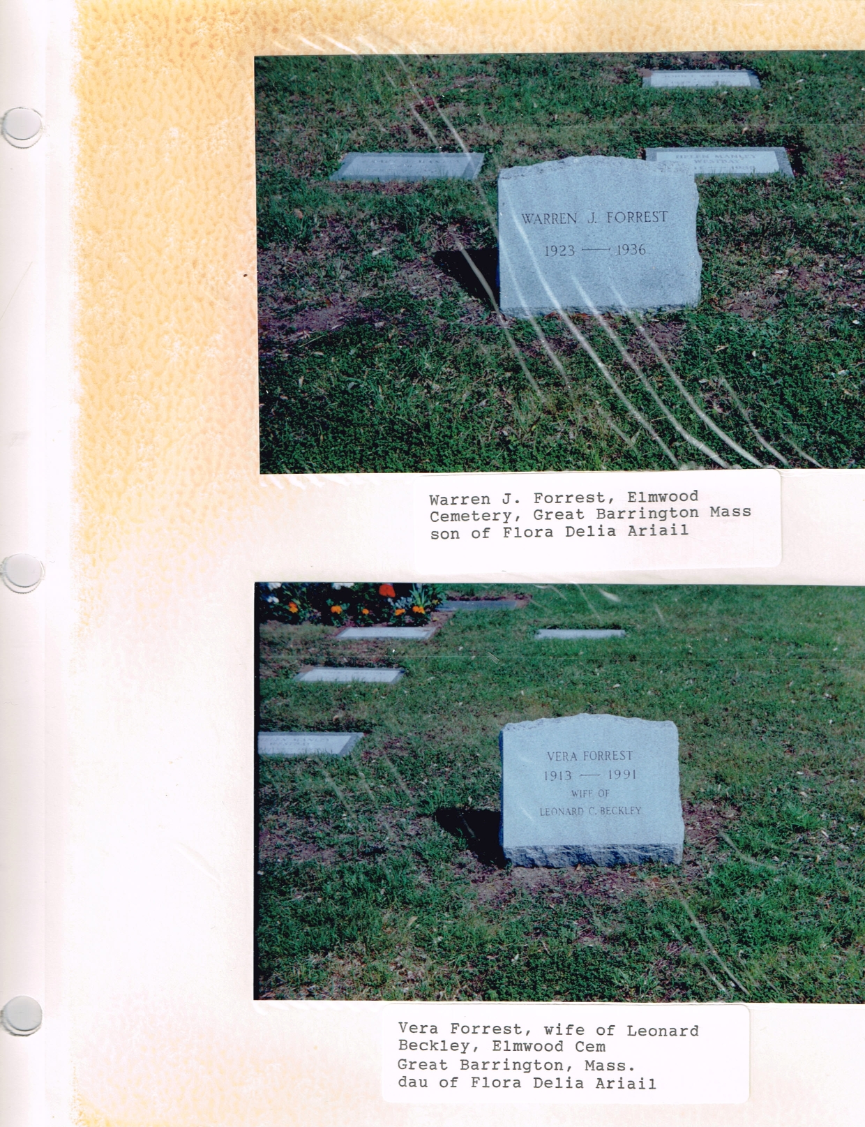 Top picture is of the marker for Warren Joseph Forrest, son of Flora Delia Ariail. Bottom picture is marker for Vera Louise Forrest, wife of Robert Francis McCarthy and 2nd Leonard Curry Beckley. She was the daughter of Flora Delia Ariail.