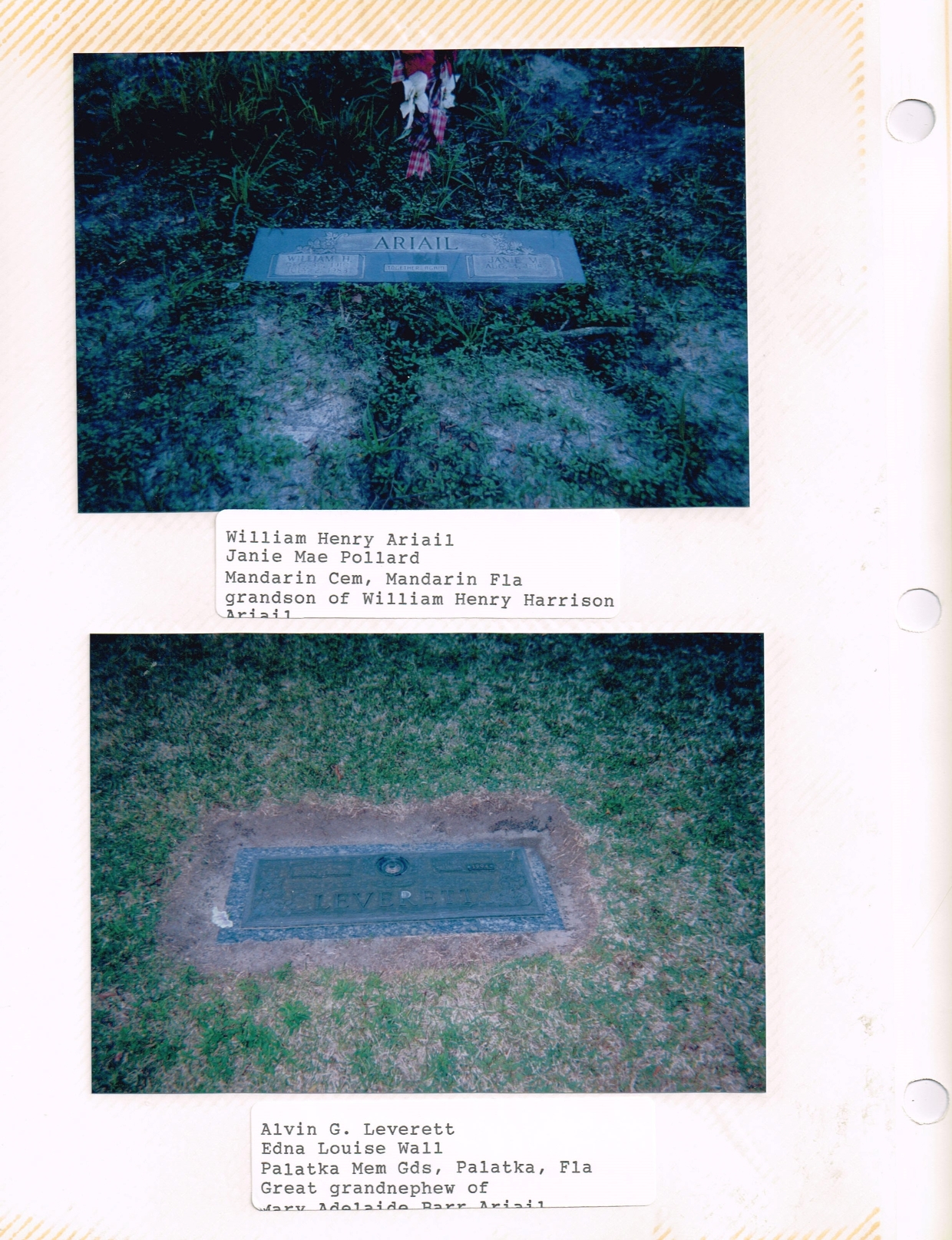 Top picture is marker for William Henry Ariail and his wife Janie Mae Pollard. William is the son of John Franklin Ariail. Bottom picture is grave marker for Alvin George Leverett, Jr., and his wife Edna Louise Wall. Alvin is a grand nephew of Mary Adelaide Barr, wife of William Harrison Ariail.