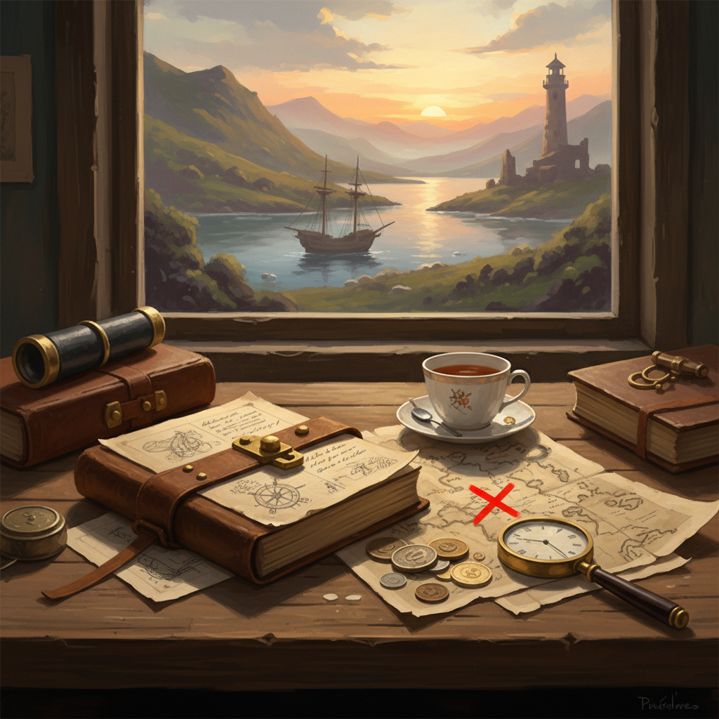To her surprise, the door creaked open at her touch, revealing a home untouched yet alive with potential clues. Books lay scattered as if in the midst of a vibrant conversation, a reflection of Horace’s mind, ever curious and expansive. On his desk, amidst stacks of letters and papers, lay a crumpled map marked with a red “X” on an uncharted location far north, deep in the forest.